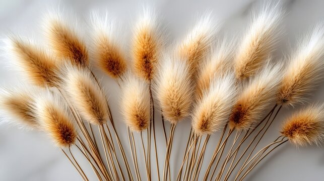 Soft light illuminates fluffy seed heads of plants in a field at sunset