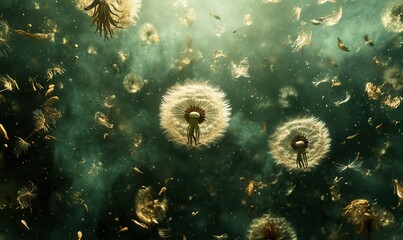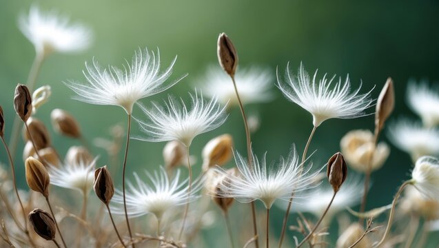 Close-up of dandelion seeds with brown stems and fluffy white seed heads against a blurred green background.