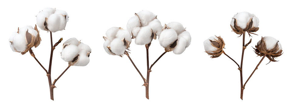 set of cotton plant heads with fluffy seed bolls and brown buds