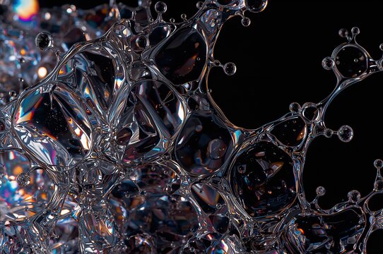 Microscopic Soap Bubbles Close-Up: Abstract Liquid Water Reflections and Colorful Patterns in Fluid Dynamics with Light on Black Background