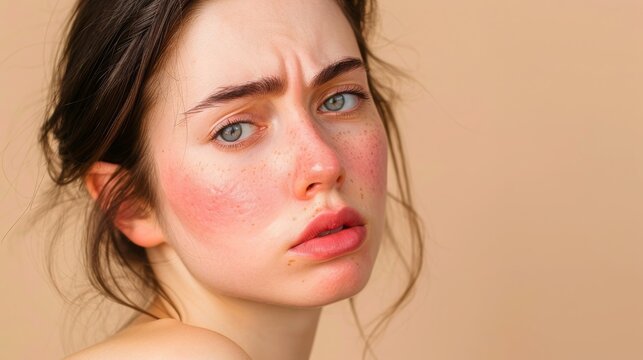 Portrait of a woman with flushed cheeks, looking thoughtful and slightly sad, set against a neutral background. Concept of emotion, contemplation, and natural beauty.