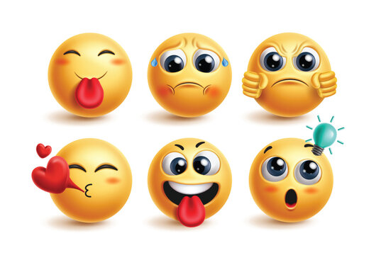 Emoji cute emoticon characters vector set. Emoticons face character in charming, lovely, worried, arrogant, flying kiss and clever facial expressions for 3d graphic icon collection. Vector