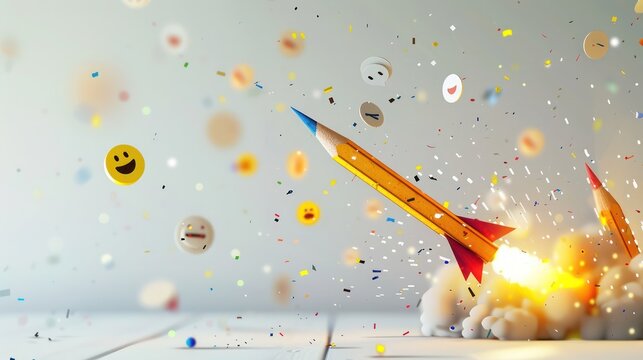 An innovative display featuring a pencil rocket blasting off with paper emojis flying around, all on a white mockup background to highlight creativity and positivity