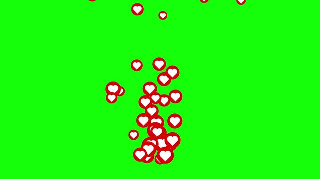 Pop up animation of red heart icon on green screen background, love animation footage suitable for social media like buttons.