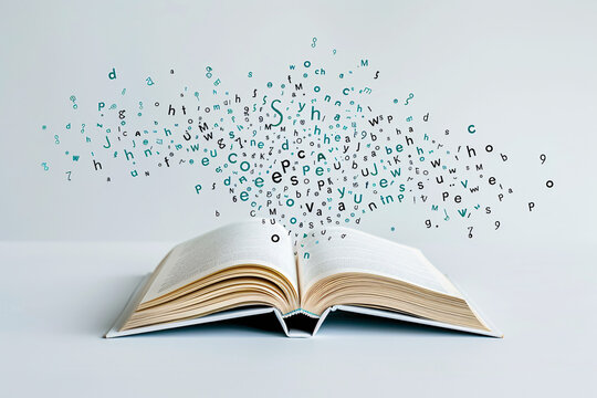 Floating Letters Erupting from Open Book, Library Shelf Background with Sunbeam Illumination for Literacy, Language Learning or Back to School Campaigns
