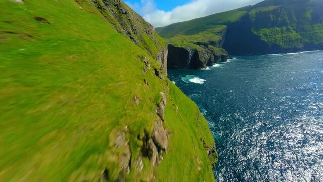 Floating slice of land with green grass surface and soil section. Flying land grass texture and empty grass field isolated. 3d rendered, isolated grass field flying in air with clouds