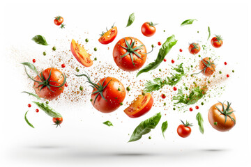 photo shows the ingredients for a flying tomatoes salad, isolated on a white background. AI generative