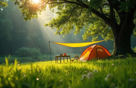 Campsite with orange tent, yellow flysheet on green meadow. Sun shines through rain in summer forest. Picnic table with mugs awaits outdoor breakfast. Peaceful travel adventure, vacation in nature.