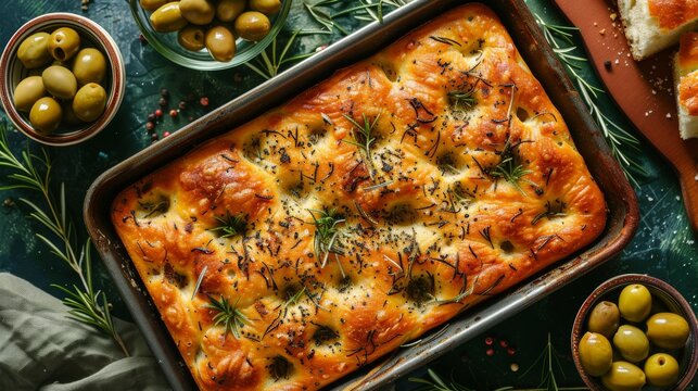 Freshly baked Italian focaccia bread with herbs and olives on top