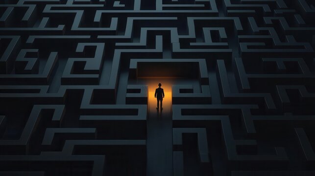 Confident founder facing glowing maze, metaphor for startup challenges and strategy