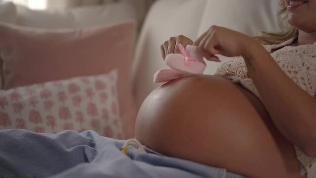 pregnancy and motherhood concept. focus on huge belly of pregnant woman sitting on couch and hands touching in sunlight living room. young future female parent feeling unborn baby in big tummy.