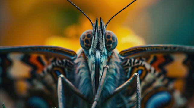 A butterfly in a macro shot against the sunset background with focus on its eyes and antennae