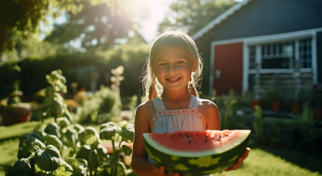 Adorable little child with blond hairs eating watermelon in summer garden. Kid tasting healthy snack. Selective focus on watermelon, summer Holiday concept with sunlight in the green garden