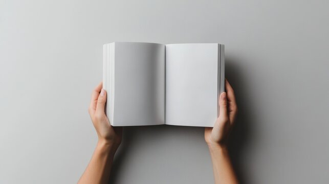 39.A top-view image of hands holding an open magazine with smooth, unmarked pages, against a soft grey background, emphasizing simplicity and focus on the blank space.