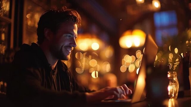 Hands typing on a laptop, elegant ambiance with a marble table, professional setting with soft bokeh lights, night work vibe