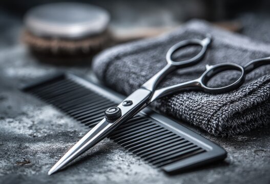 Close-up barber tools.  Scissors, comb, and towel on dark surface