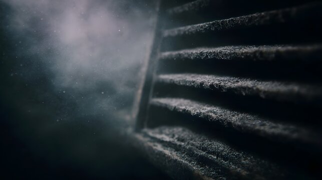 Close up view of dust particles floating around a heavily clogged and dirty air filter