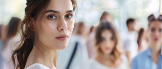 In a bright, crowded room, a woman stands out with her calm demeanor and focused gaze, creating a contrast to the blurred, bustling background.