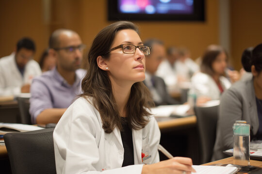 Focused female doctor attending ophthalmology training session with colleagues in modern classroom