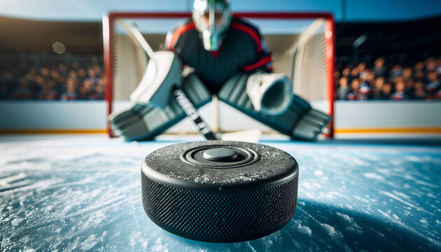 Close-up of a hockey puck on ice, with a goalie in the background ready to defend the goal