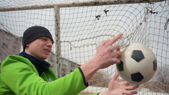 Young Male Goalkeeper Practicing Soccer Skills with Outline, Isolated Vector Illustration