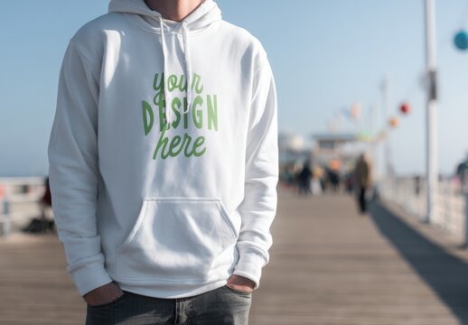 create an ultra-realistic photograph of the mockup of white hoodie with green text "your design here" on it, worn by man standing at seaside boardwalk. the focus should be sharp and product details