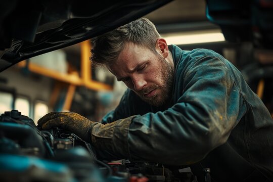 A focused mechanic works diligently under the hood of a car. His dedication to the task is evident in this impactful image. A realistic depiction of craftsmanship. Generative AI