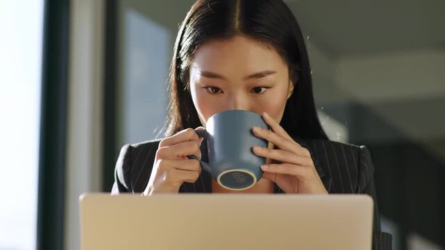 Smiling businesswoman working on laptop while drinking coffee in office setting
