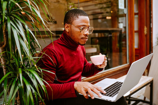 Side view of rich stylish focused African American male entrepreneur sitting on bench near cafe outdoors and browsing laptop while drinking delicious coffee and working remotely on project