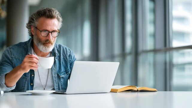 Focused adult man working intently on a laptop computer while enjoying a warm beverage at his well-lit home office desk indoors