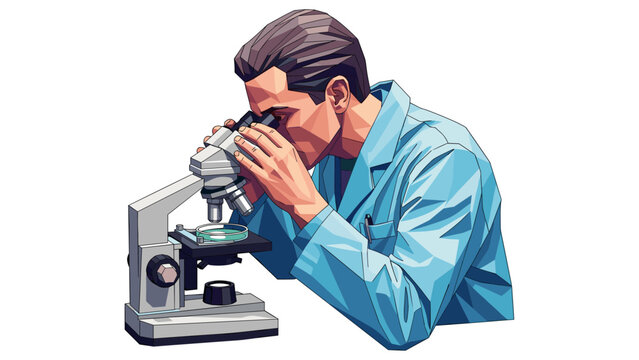 Scientist in white lab coat examining specimen through a modern microscope isolated on transparent background