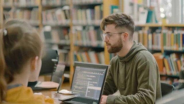A man is seated in front of a laptop computer, focused on his work in a library setting, A cybersecurity educator teaching students about online safety