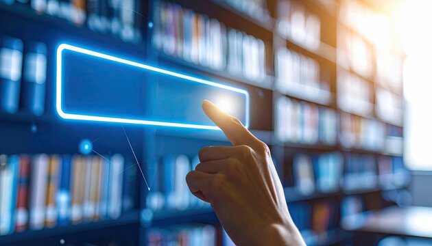 Hand pointing at a digital screen in a modern library with bookshelves in the background, symbolizing technology in education