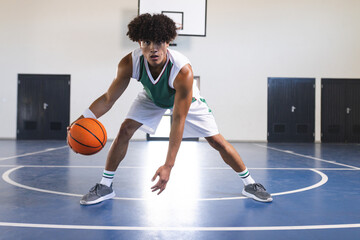 Basketball player in crouched stance directing ball during practice. Concept of gameplay training, movement breakdown, athletic performance improvement and focused session work.
