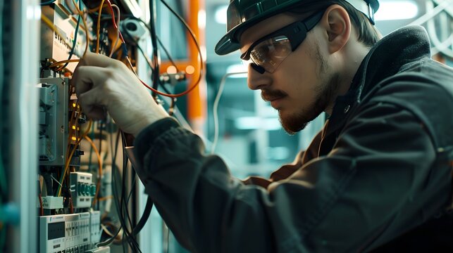 Male engineer checks control panel with many lights and dials. Technician works on complex electrical equipment rack. Pro man maintains server room hardware with focus.
