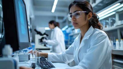 A focused scientist in a laboratory examines genetic sequencing data on a computer screen, engaged in advanced biomedical research.