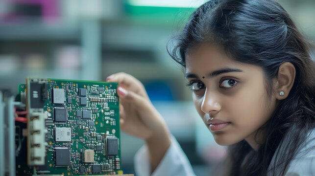 Young Woman Examining a Circuit Board in a Lab