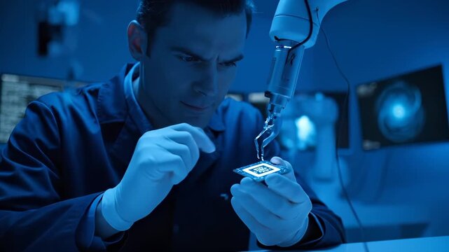 A focused engineer meticulously examining a complex microchip with keen interest