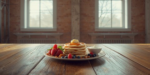 Morning meal arrangement on rustic wood in an urban loft, focusing on balanced nutrition, World Nutrition Day