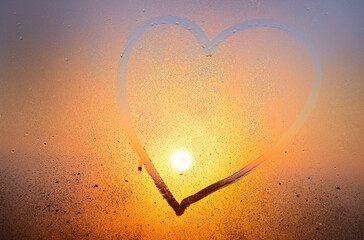 Shape of heart painted on fogged glass of window. Drawing of a heart on window, blurred background