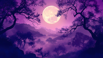Mysterious deep plum forest misty foggy mountainside ancient twisted tree branches eerie moonlight ambiance whispers of forgotten secrets. Whispering. Illustration