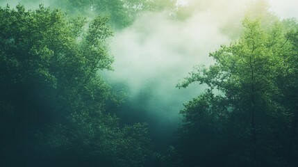 Morning mist rolling through a dense forest, foggy weather, mysterious ambiance