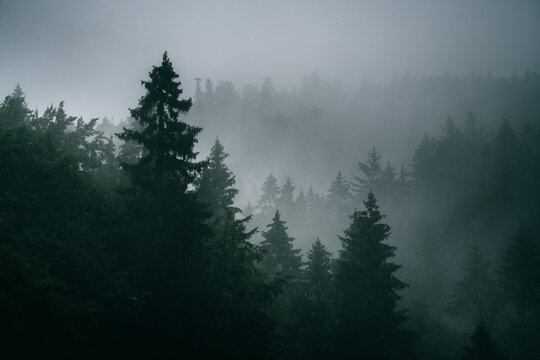 the rural village town in fog in misty morning a cold fresh foggy morning at village area foggy countryside meadow landscape in early morning scary view of wilderness and deserted pasture