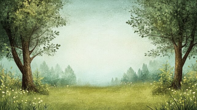 A peaceful misty morning meadow with the sun rising in the background, peaceful, sunrise, misty, grass, tranquility, rural, landscape, field, trees, meadow, foggy, tranquil, tranquil, beauty