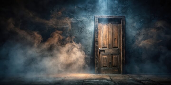 Dark mysterious room with old wooden door and a hint of fog outside, foggy night