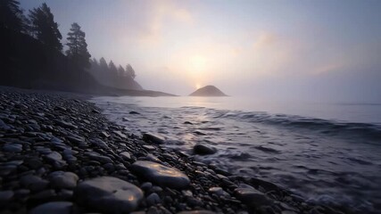 Baltic sea in a morning fog at sunrise, Sweden. Soft sunlight, picturesque scenery