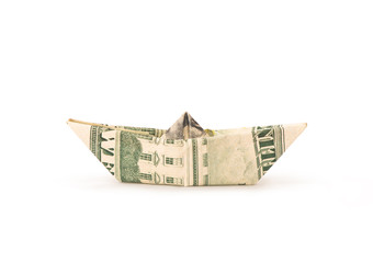 Creative use of one dollar bill folded into a boat beside stacked coins