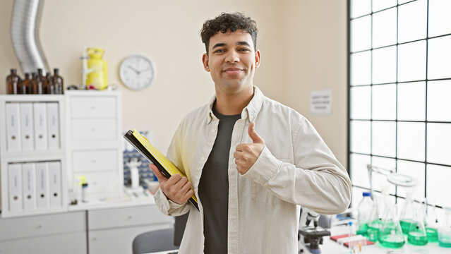 A confident young man with a folder gives a thumbs up in a modern laboratory setting, embodying professionalism and a positive attitude.