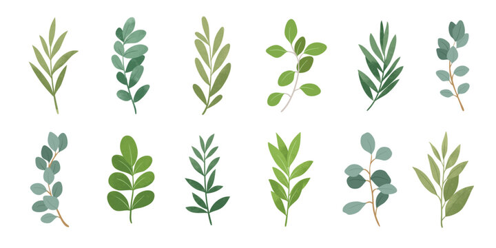 Collection of botanical elements in green color. Set of eucalyptus leaf, branches, leaves and herb with watercolor. Hand drawn of foliage vectors for wedding decor, website, graphic and shop.