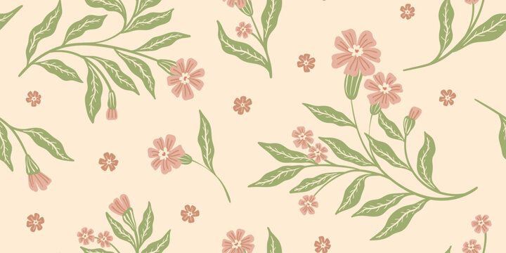 Seamless floral pattern, decorative ditsy print, ornament in a retro folk motif. Botanical design: hand drawn small flowers, large branches, leaves abstract on a light background. Vector illustration.